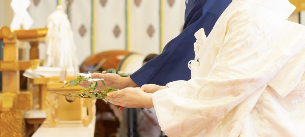 新郎新婦が玉串を神前に捧げて幸せを記念します。
